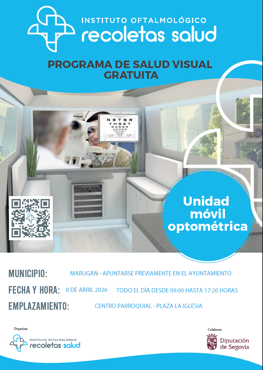 El próximo día 8 de abril de 09:00 a 17:20 horas, la unidad móvil de optometríca del Instituto Oftalmológico Recoletas Salud, en colaboración con la Diputación de Segovia, realizará una jornada de revisión visual en el Centro Parroquial de Marugán. Las personas interesadas deberán apuntarse previamente en el Ayuntamiento.